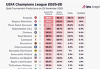 本赛季保持欧冠全胜的阿森纳仍然领跑,拜仁/巴黎/曼城排234位。