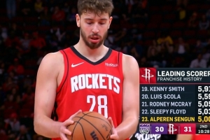 火箭主场迎战国王,第二节罚球时申京生涯得分破5000。